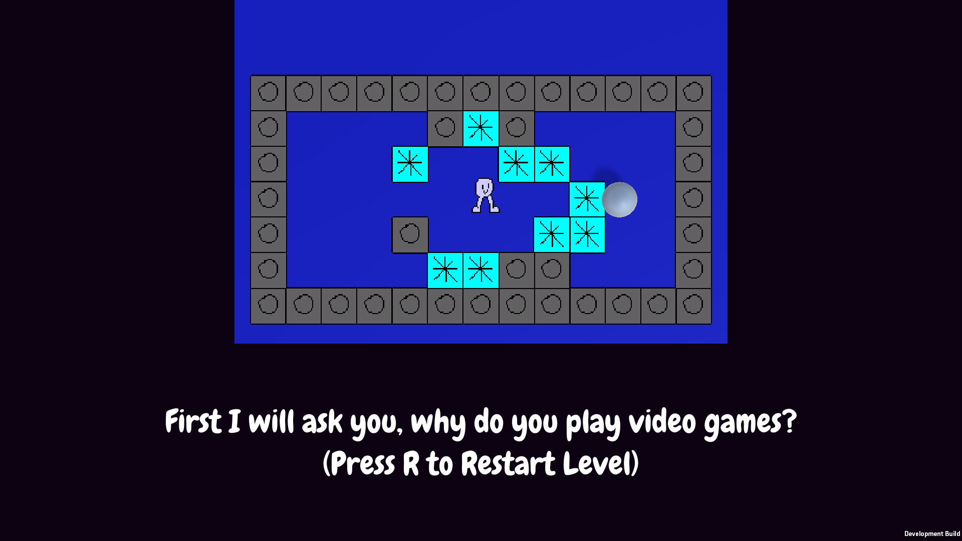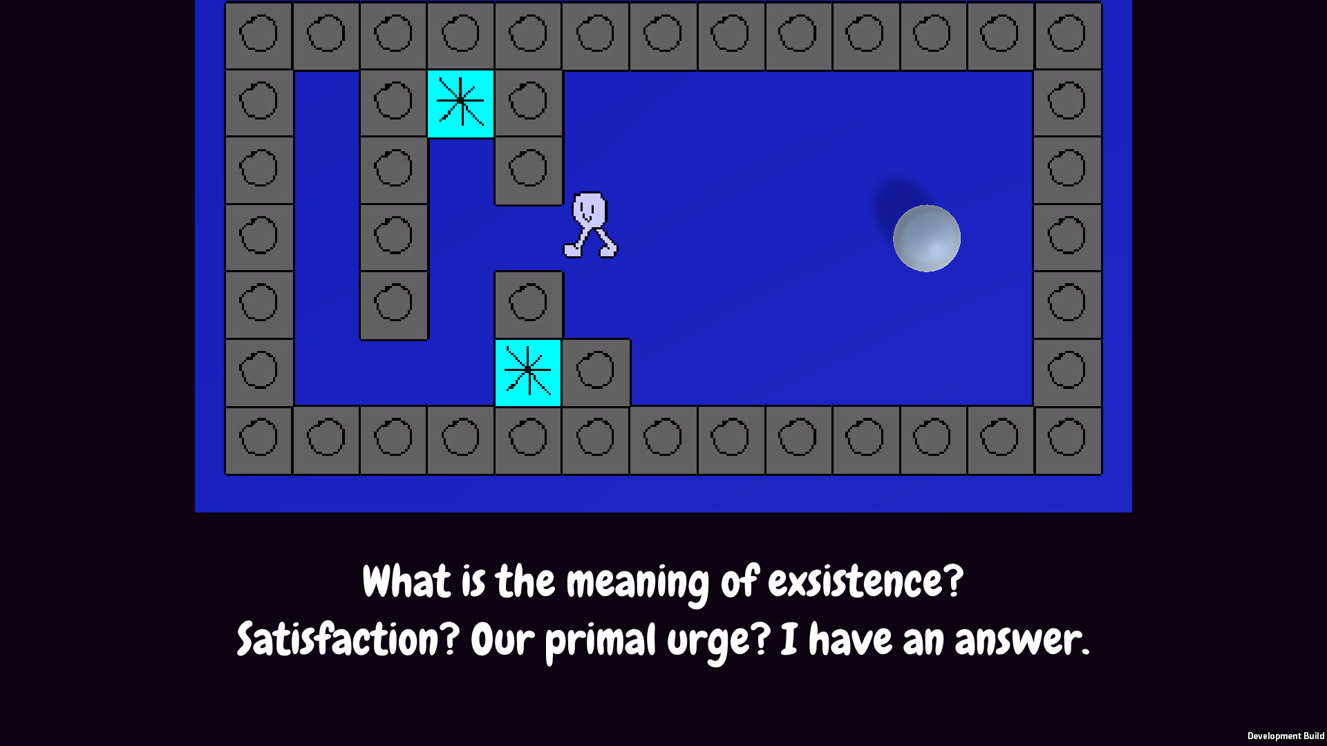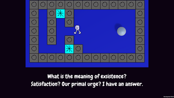 Jelsius is a short block-pushing puzzle game with little bit of commentary about life and video games. The camera will zoom out as you complete puzzles to emphasise the dark void in the background and the emptiness of existence and the player character ponders the meaning for their life and joyful expression.